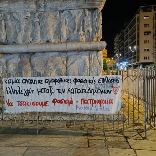 Χθες το βράδυ, Παρασκευή 14.11.2025, αναρτήσαμε πανό στην Καμάρα, ως ένδειξη αλληλεγγύης στα δύο άτομα που δέχτηκαν ομοφοβική επίθεση την προηγούμενη εβδομάδα στην Θεσσαλονίκη.
